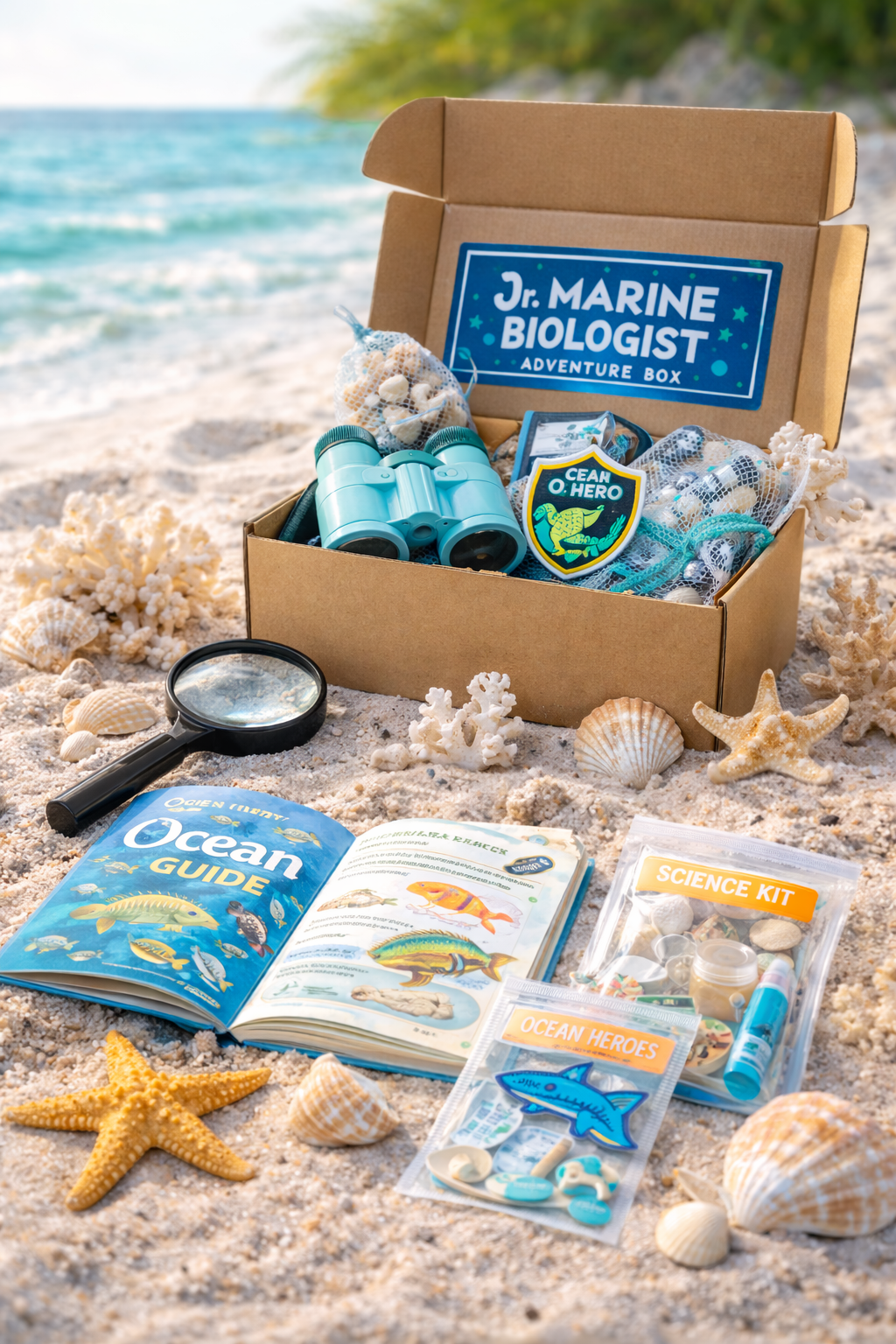 Each box includes a beautifully illustrated marine life book filled with fun facts and learning adventures.
